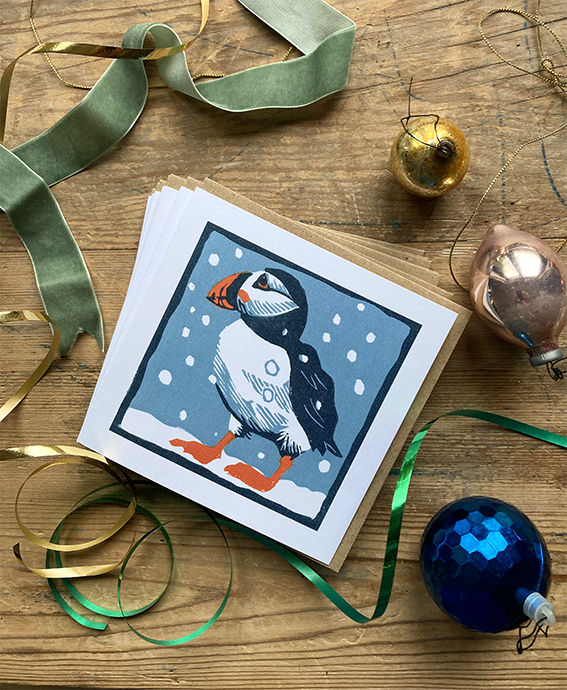 This ‘Puffin in Snow’ Christmas card features Joanna's linocut image of a brightly coloured puffin in the falling snow.