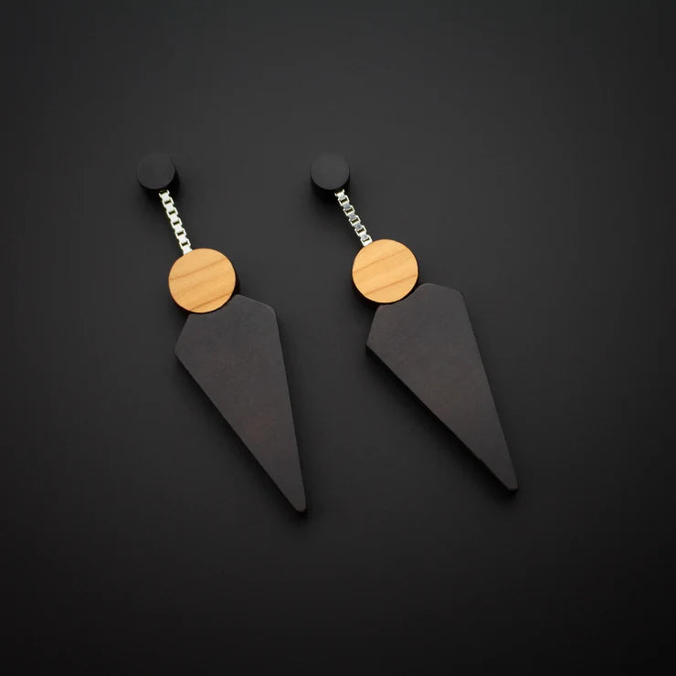 The Lina earrings are made in either natural or ebonised (black) yew wood and hang from sterling silver box chain, giving them lovely movement and a touch of sparkle. They are attached to a sterling silver ear post with butterfly back and measure approximately 2.4cm x 3.5cm.