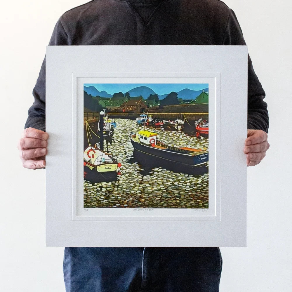 Stunning print of the Annalong Harbour based on a original acrylic painting by Kevin Collins. With a background in handloom weaving, his brush strokes emulate the warp and weft of weaving, resulting in a textural and woven appearance.
