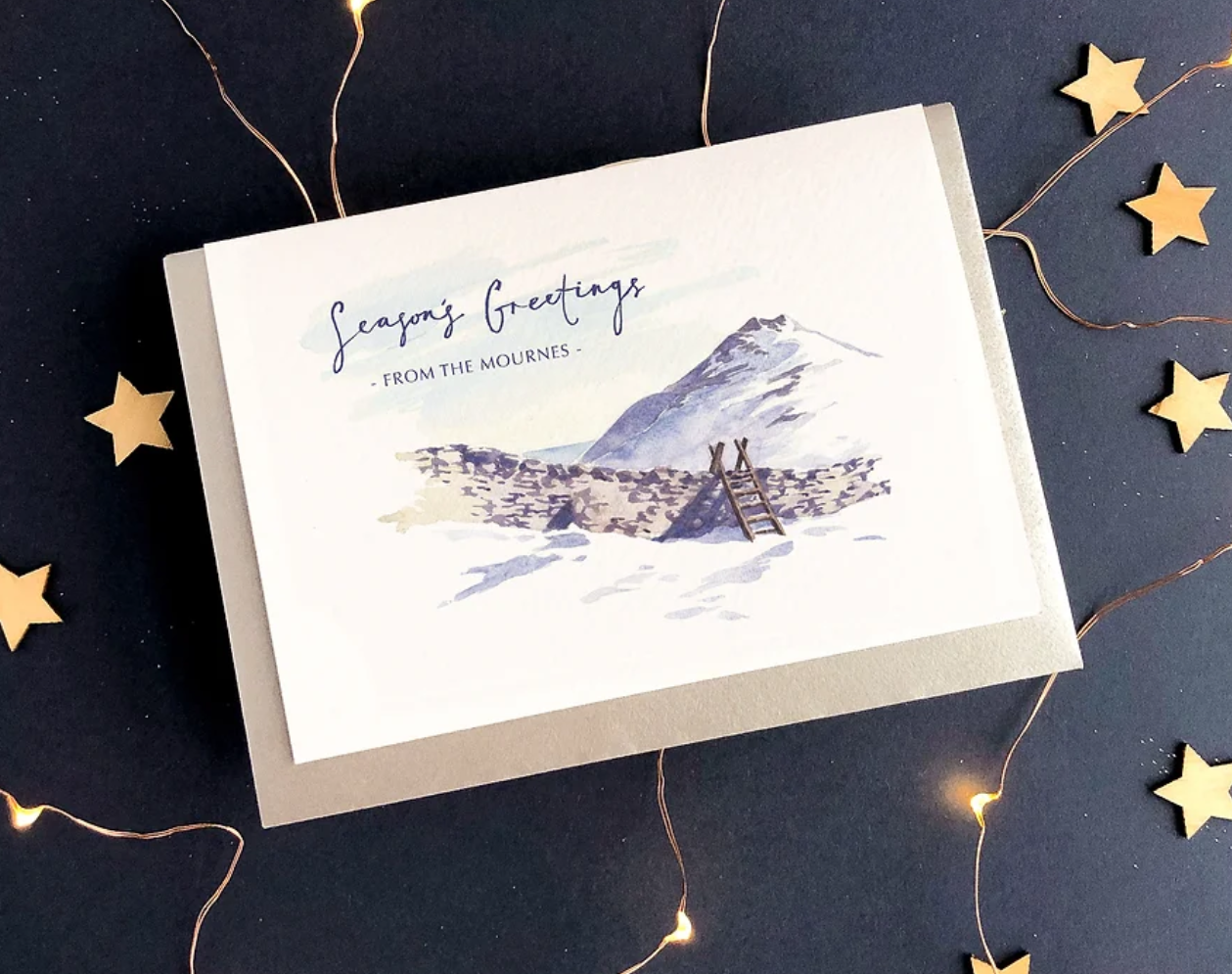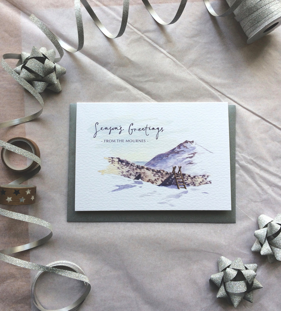 Greeting card features watercolour painting of the Mourne Wall in the snow, with hand rendered text:"Season's Greetings from the Mournes"