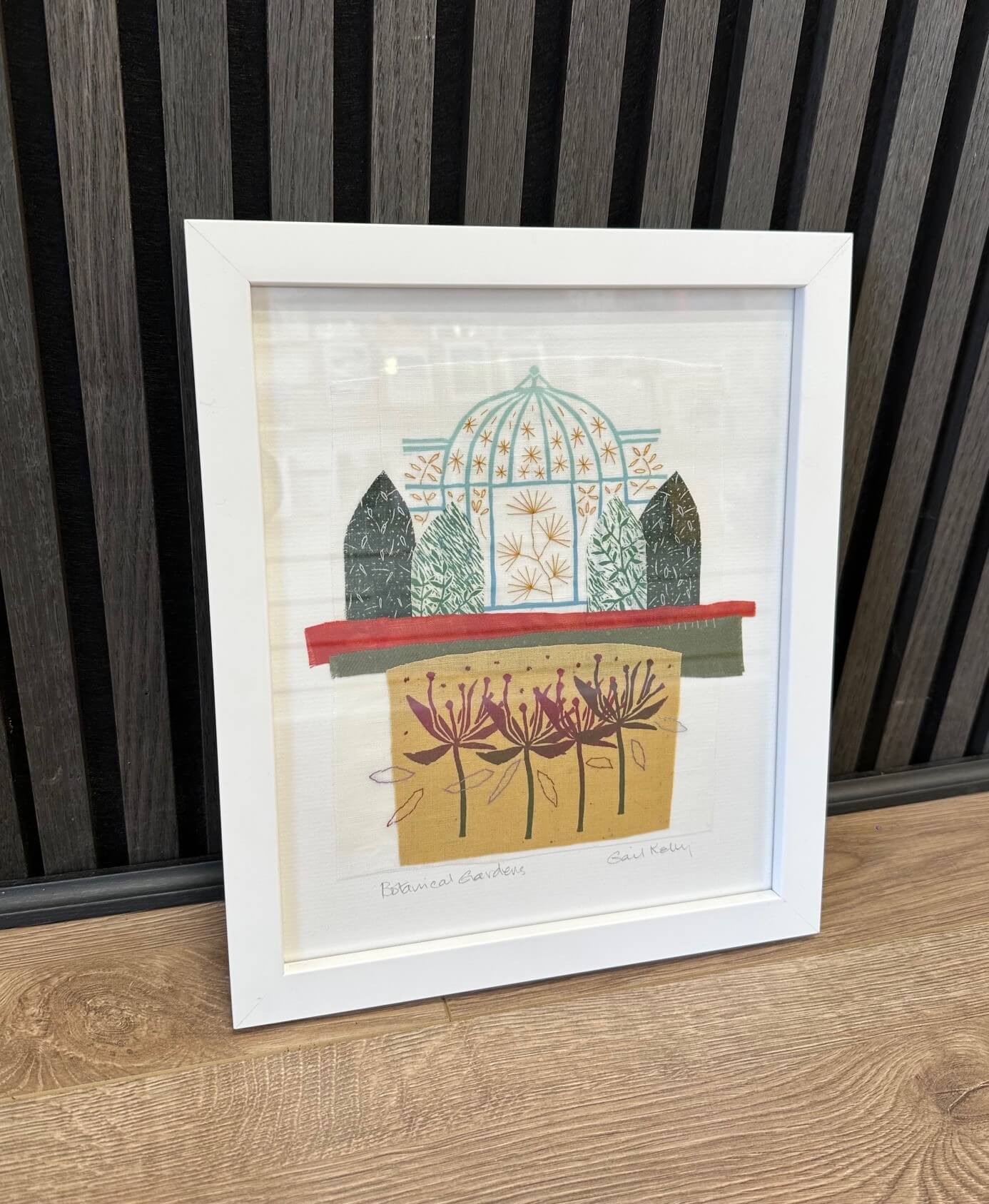 Gail Kelly's hand stitched linen collages are inspired by the countryside and gardens. She prints her linocuts on irish linen using her victorian cast iron press and stitches her linen collages by hand.