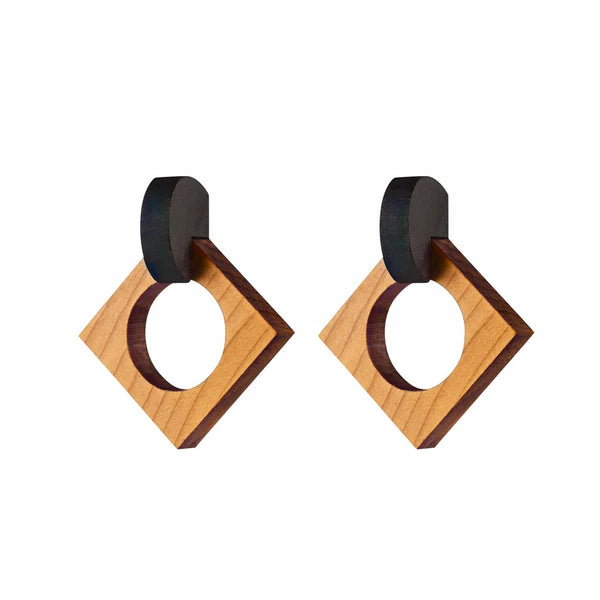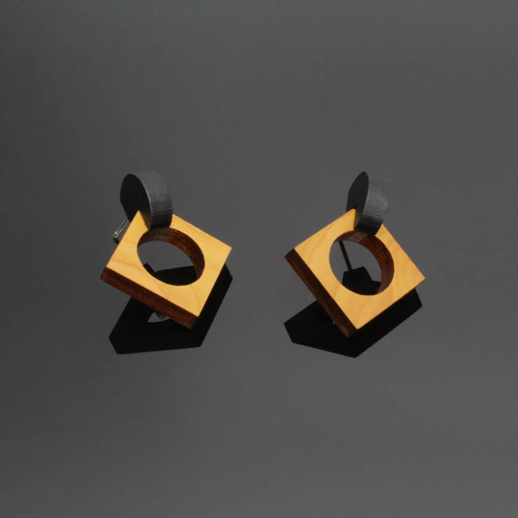 These large but lightweight geometric wooden stud earrings combine natural and ebonised Yew to create contrast both in form and colour. They are attached to a sterling silver ear post with butterfly back and measure 2.5cm x 3cm.