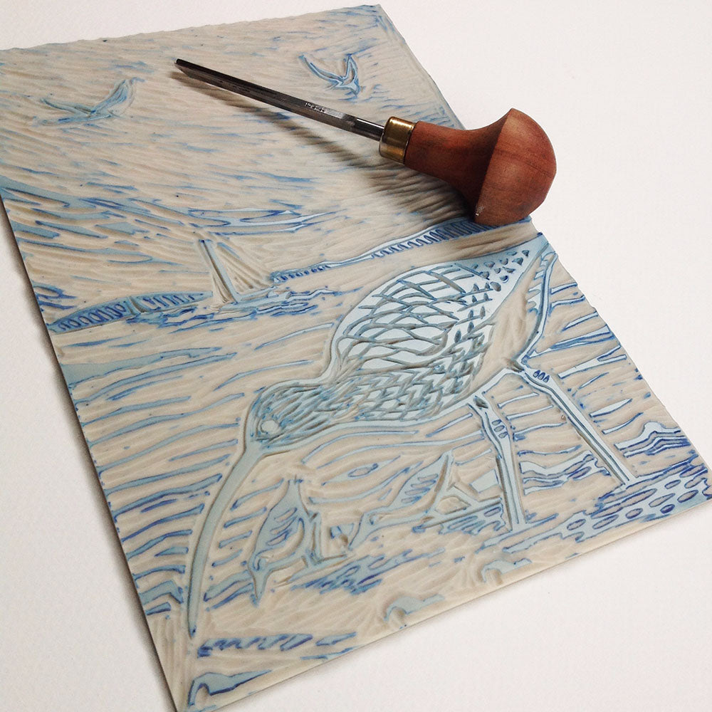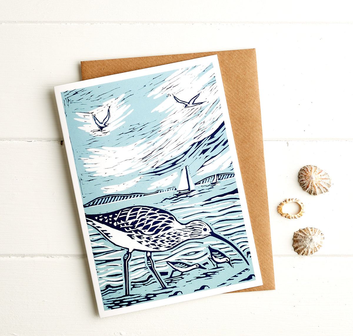 A lively summer coastal scene from my linocut print. It’s a sunny day, there’s a breeze and two wooden yacht race in the distance. On the shore a curlew and some redshank look for food in the wet sand.