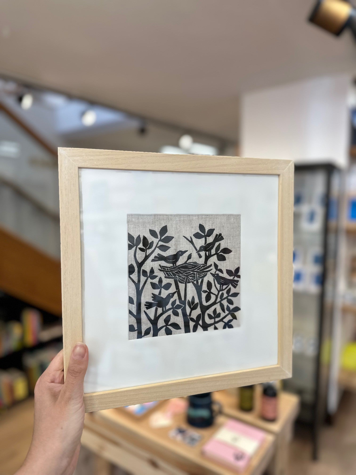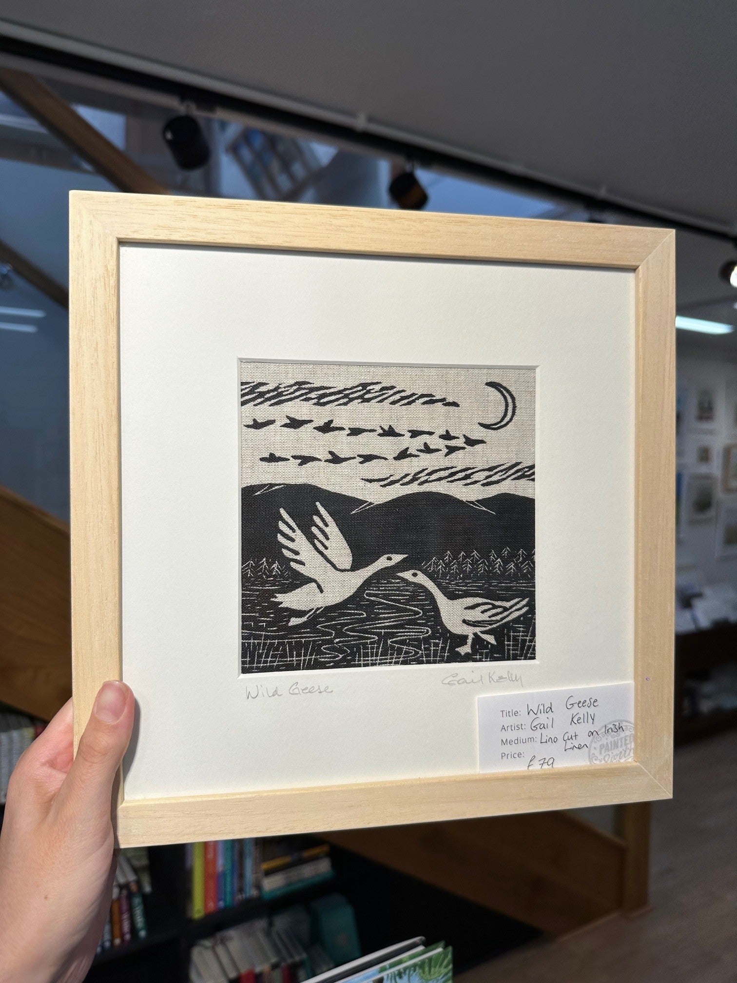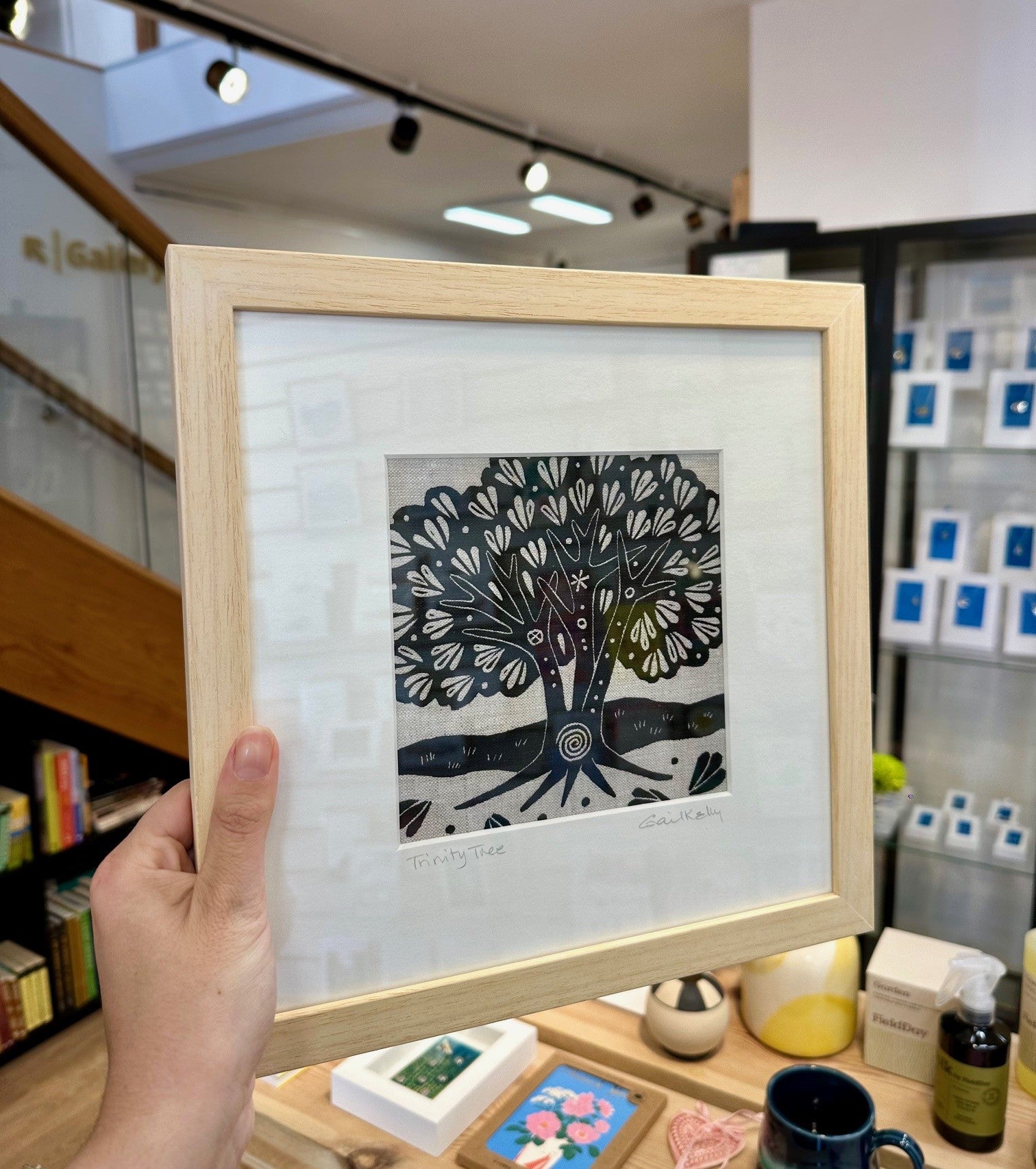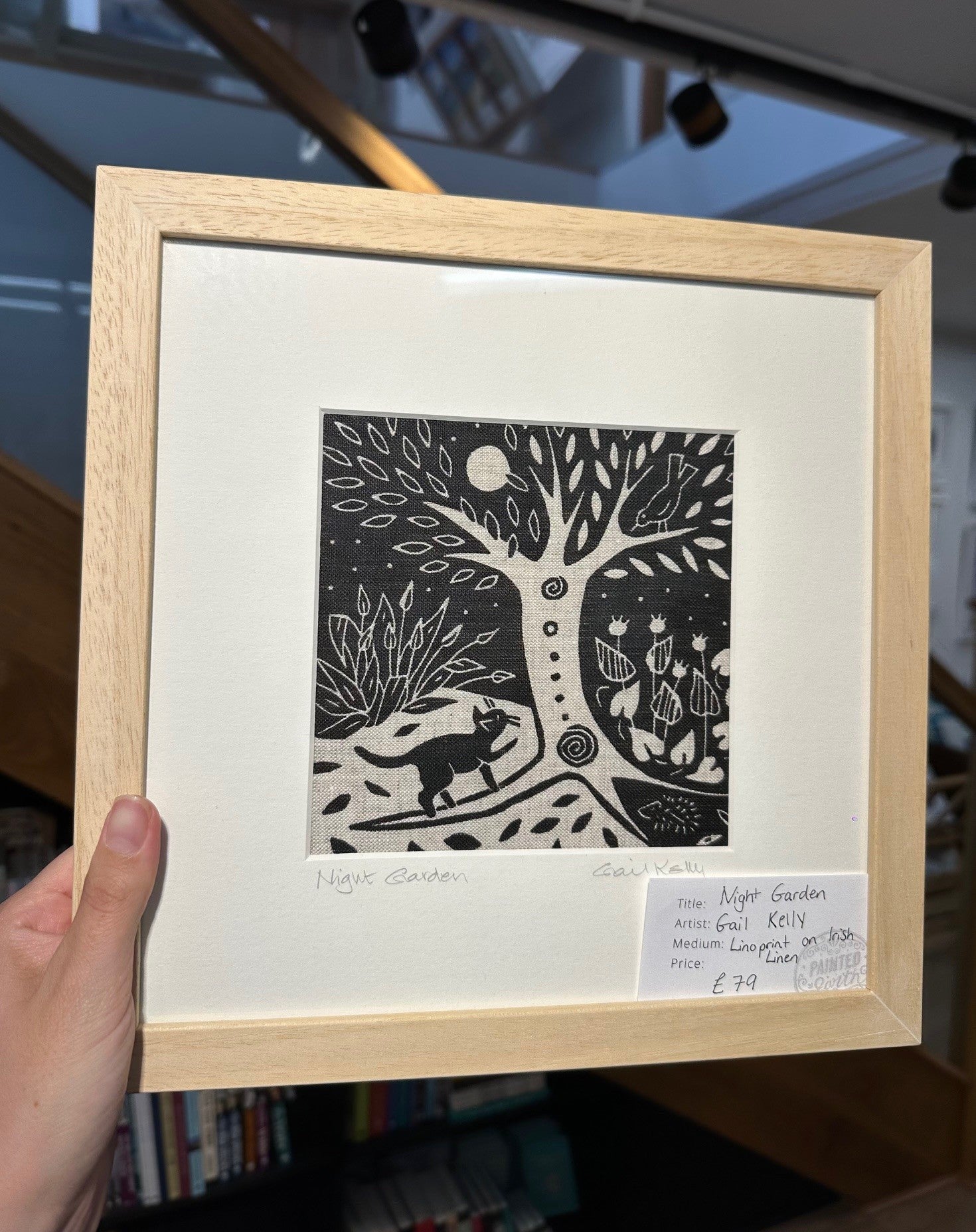 Gail Kelly's lino prints are handprinted on irish linen and are inspired by the countryside and gardens. She prints her linocuts on irish linen using her victorian cast iron press and stitches her linen collages by hand.
