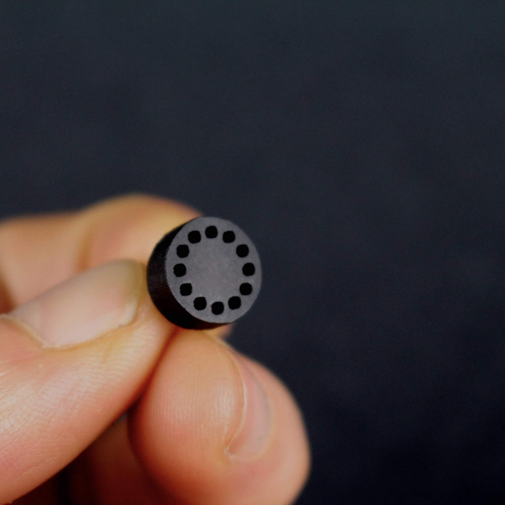These small circle studs have subtle cut work reminiscent of a seed head, and are perfect for casual wear. They are made in natural or ebonised native Irish yew wood and are polished with Burren wildflower beeswax. They are attached to a sterling silver ear post with a butterfly back and measure 1cm in diameter.
