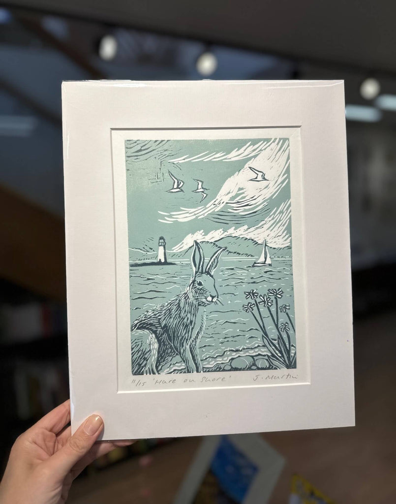 ‘Hare on Shore’ Mounted Original Linocut Art Print