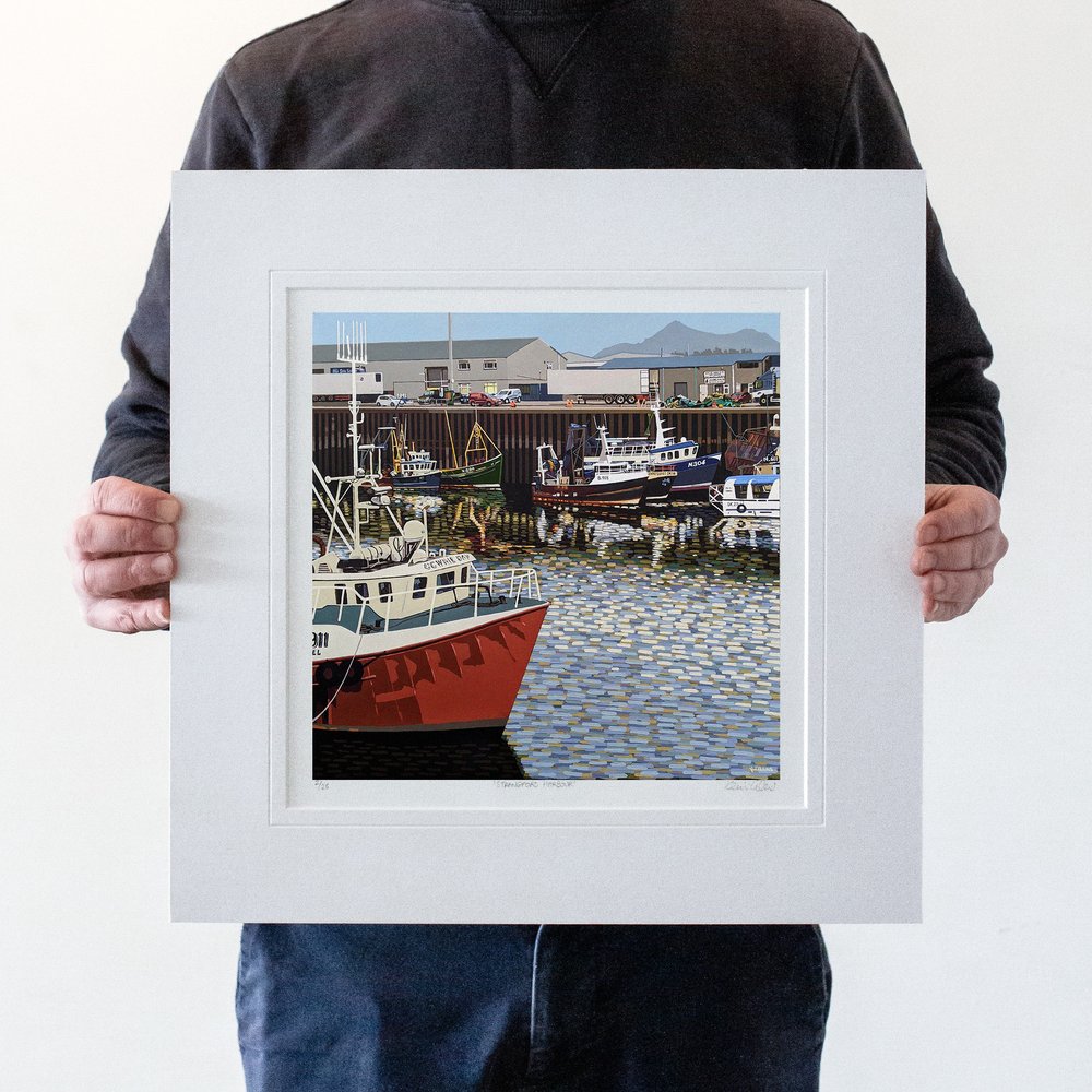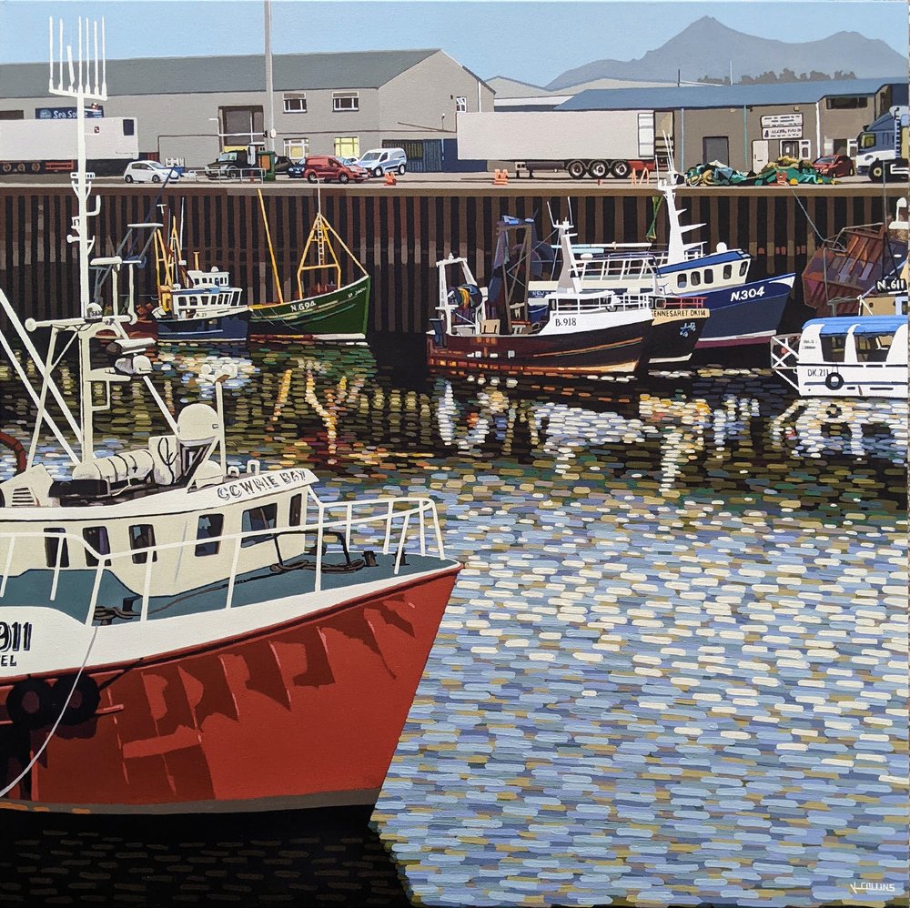 Stunning print of the Kilkeel Harbour based on a original acrylic painting by Kevin Collins. With a background in handloom weaving, his brush strokes emulate the warp and weft of weaving, resulting in a textural and woven appearance.