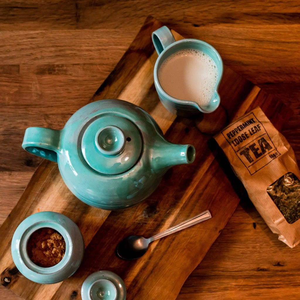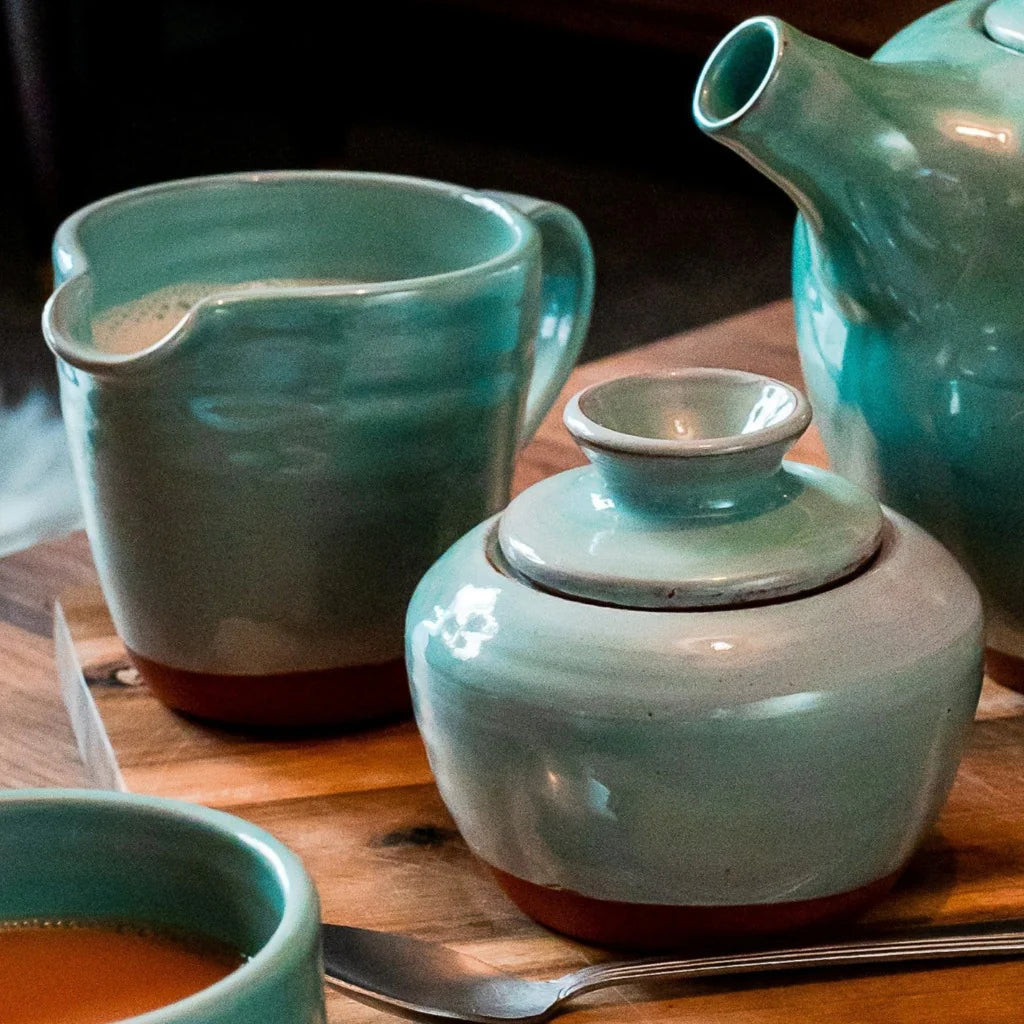 Each piece in the collection is made with a warm toasty terracotta clay which is left exposed at the base to contrast beautifully with the smooth turquoise glaze that has lovely variations as it moves down the pot and highlights the lines and edges of the pieces.