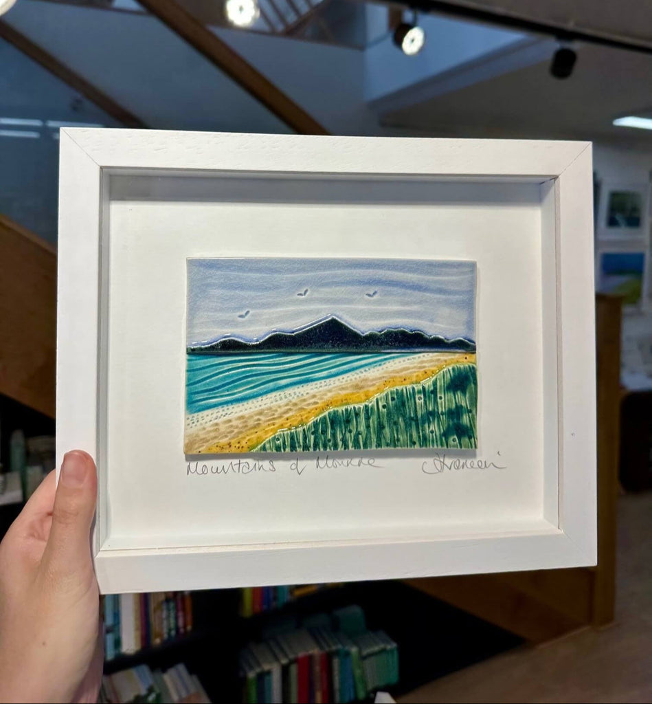 A Handmade ceramic 'Mourne Mountains' Tile in a box frame, made locally by Jakki Trainor the lovely craftsperson behind 'Figment Ceramics'. Jakki's studio is close by in Bryansford and her work is all handmade and so every piece is unqiue.