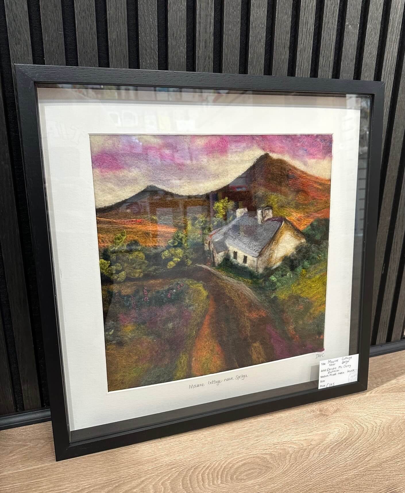 Handcrafted felt & textile piece by Deirdre McClorey. Deirdre is a textile artist based in Rostrevor Co. Down. She uses both dry and wet felting techniques, incorporating recycled textiles and Donegal Tweed into her work alongside some hand embroidery. She incorporates bog cotton, picked in the Mournes and local Mourne fleece in her imagery of the Mournes and beyond.