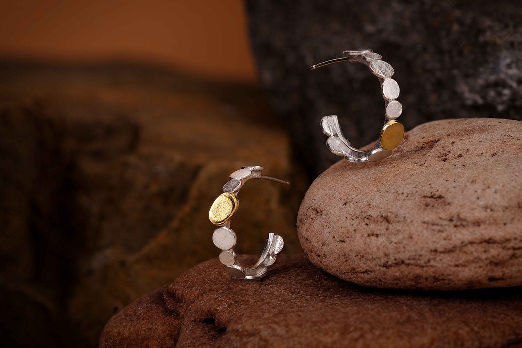 Like finding that one of a kind pebble on the beach. A crown of textured silver and a rich 22ct gold, flat pebbles. Designed for that special person or time in your life.