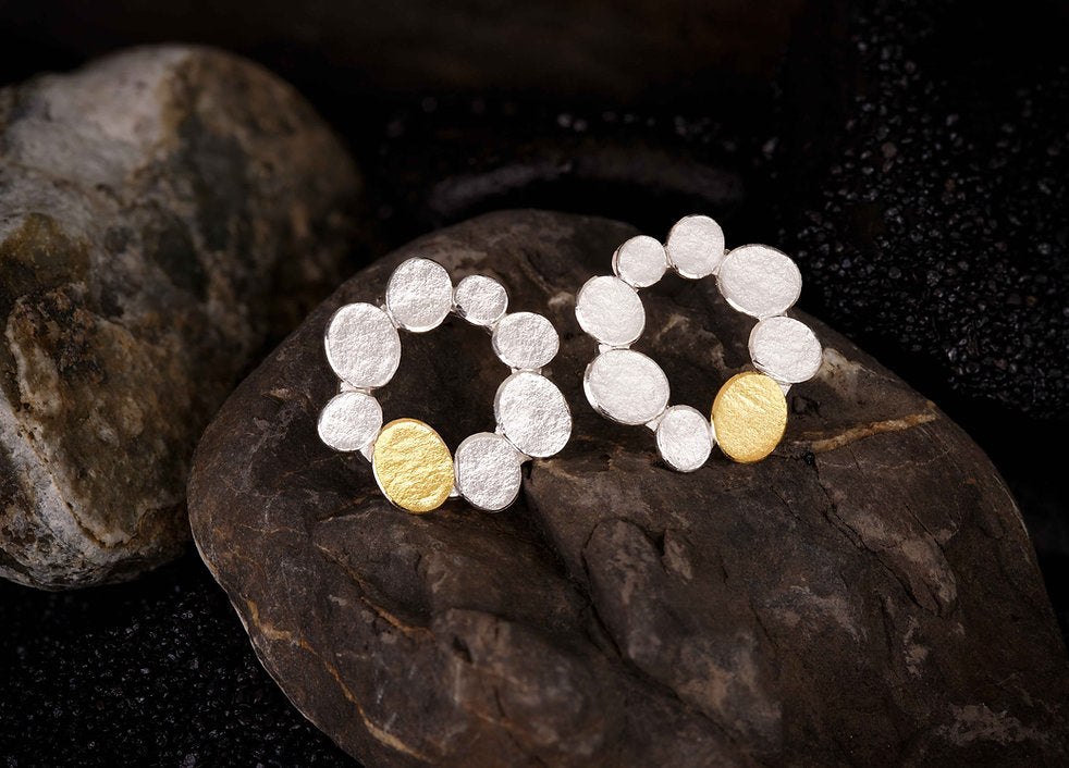 Like finding that one of a kind pebble on the beach. A crown of textured silver and a rich 22ct gold, flat pebbles. Designed for that special person or time in your life.