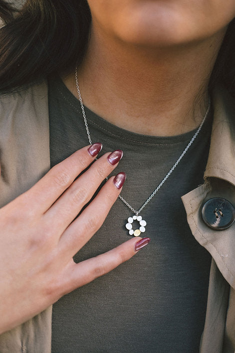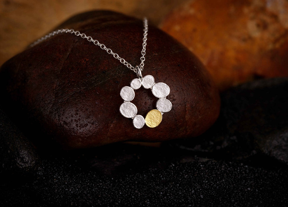 Like finding that one of a kind pebble on the beach. A crown of textured silver and a rich 22ct gold, flat pebbles. Designed for that special person or time in your life.