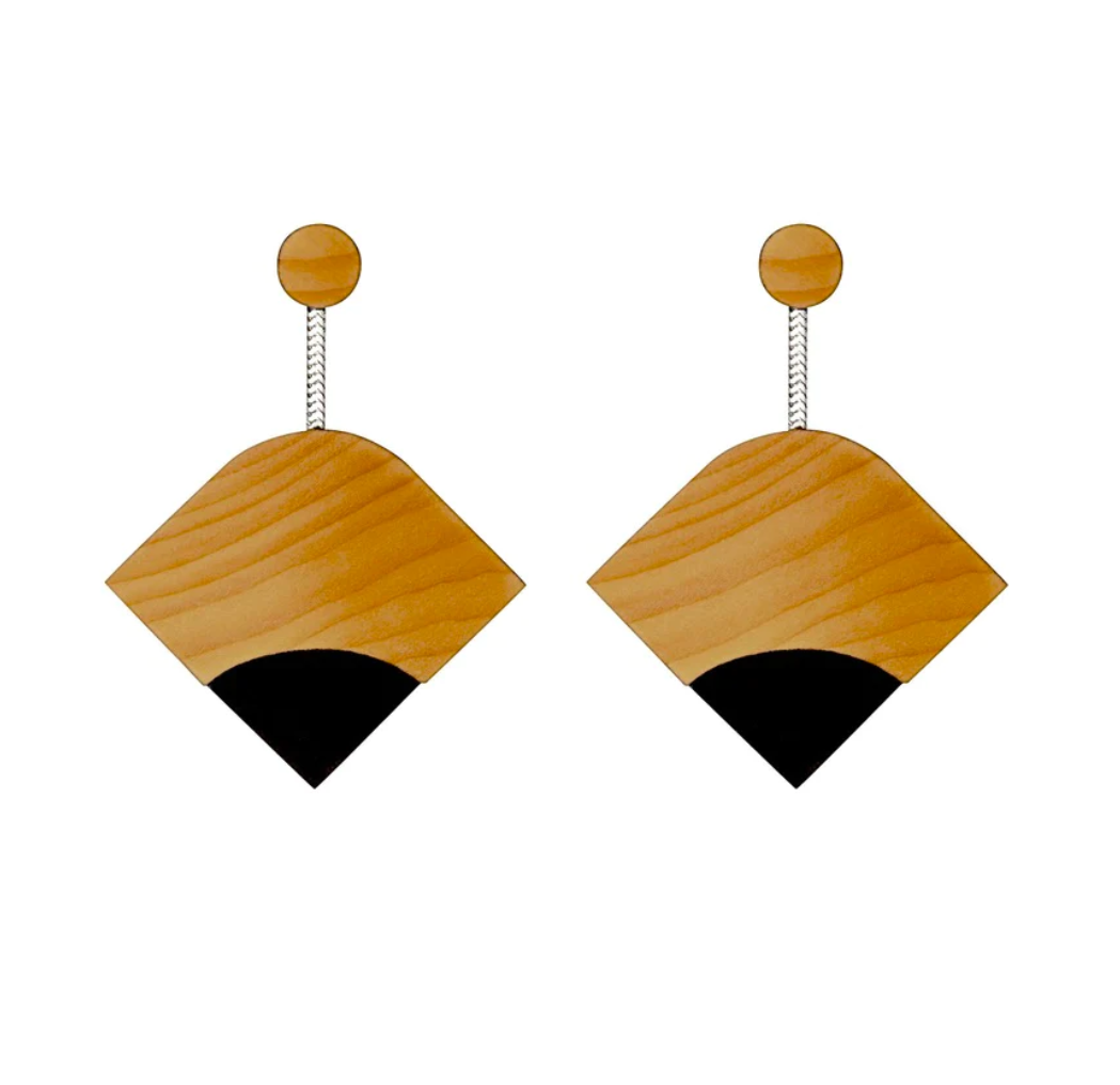 These pendulum inspired drop earrings play with ideas of movement and balance and are influenced by the work of artist Wasilly Kandinsky. They are made in contrasting natural and ebonised native Irish yew and hang from sterling silver snake chain. They are attached to a sterling silver ear post with a butterfly back and measure approximately 2.5cm x 5cm.