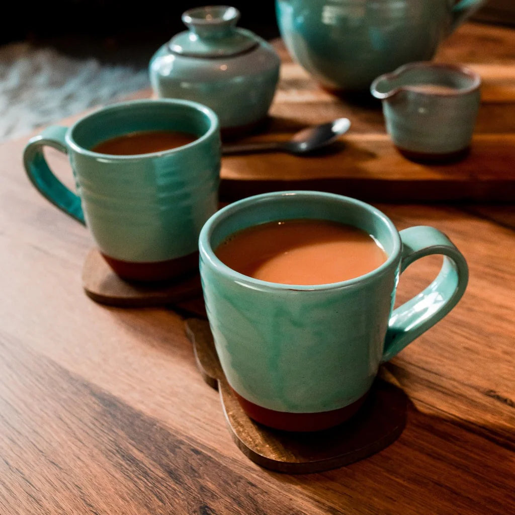 Each piece in the collection is made with a warm toasty terracotta clay which is left exposed at the base to contrast beautifully with the smooth turquoise glaze that has lovely variations as it moves down the pot and highlights the lines and edges of the pieces.